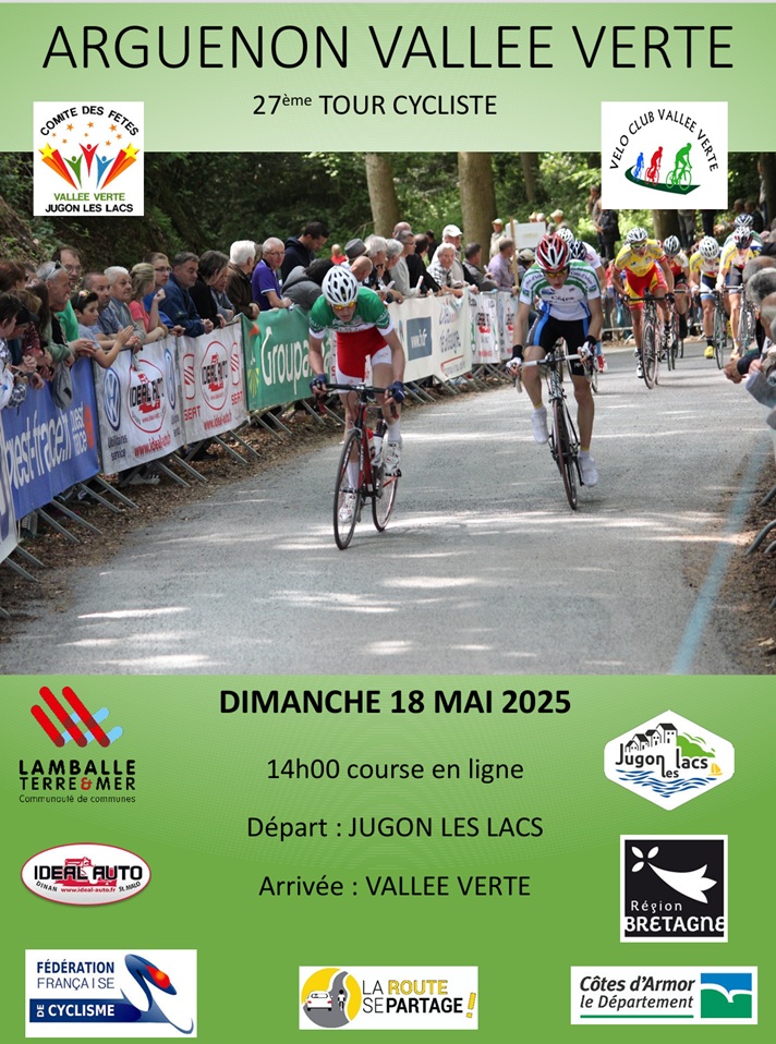 La 27e édition d'Arguenon-Vallée Verte (Fédérale Juniors) se dispute le dimanche 18 mai à Jugon-les-Lacs dans le département des Côtes d'Armor. 112 kilomètres -86 km en ligne + 4 tours de circuit de 6,5 km- sont au programme. Le départ fictif sera donné à 13h55 et le réel à 14h. Le vainqueur succédera au palmarès à Luc Royer (voir classement). Toutes les informations en cliquant ici.