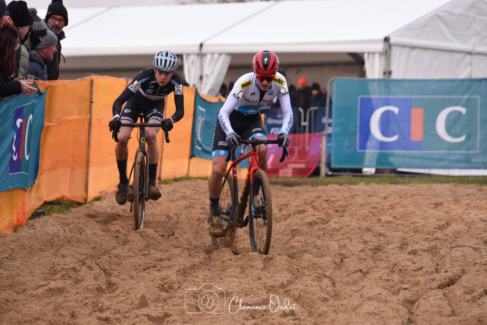 Il n’aura donc pas connu l’échec une seule fois sur les gros rendez-vous de la saison. Lauréat des trois manches de Coupe de France Cadets puis du Championnat Auvergne-Rhône-Alpes, Soren Bruyère Joumard a fait respecter la hiérarchie établie tout au long de la période hivernale en allant décrocher, ce samedi, le titre de Champion de France de cyclo-cross à Camors, dans le Morbihan (voir classement). Et pourtant, tout n’a pas été simple face à un Breton coriace à domicile, en la personne de Soen Le Pann. “C’était compliqué ! J’ai fait un bon départ, pourtant, mais dans le virage en bas du poste, je suis tombé, sans trop savoir pourquoi. J’ai eu du mal à repartir. En plus, j’ai aussi eu envie de vomir dès les premières minutes de course. J’ai eu du mal à me lancer. Après, j’ai enfin pu mettre en route et j’ai réussi à remonter jusqu’à la première place”, relatait-il en conférence de presse pour DirectVelo.