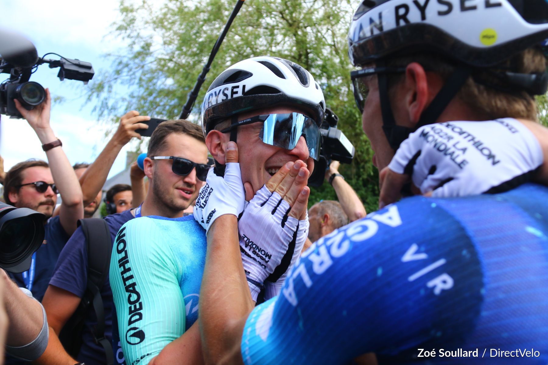 Jamais en panique durant la journée malgré les attentes placées en lui, Jordan Labrosse n'a pas douté, même s'il a suivi l'emballage final de loin. "Il a été serein, on ne l'a jamais vu s'affoler aujourd’hui. On a fait un gros boulot. Je l’ai senti serein avant la course aussi". Et le public lui a bien rendu. Durant la course, mais aussi après en s'amassant de longues minutes du podium jusqu'à la salle de conférence de presse. Certains avaient même peint la route en son honneur pour l'accompagner sur le chemin du contrôle antidopage. Autant d'images qui ont impressionné Nans Peters. "On voit tous les t-shirts “Paul Lapeira”, il l’avait dans la tête. Quand on est Normand et qu’on court en Normandie, ça fait plaisir. On sait que c’est une terre de vélo, le public l’a démontré et ça lui a donné des ailes". Et ses coéquipiers n'ont pas manqué de le porter aux nues sur le podium.