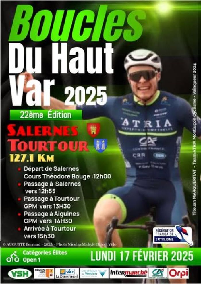 La 22e édition des Boucles du Haut-Var, challenge organisé par le Vélo Sport Hyérois, se dispute du samedi 15 au mercredi 19 février. Cette course se compose cette année de cinq épreuves inscrites au calendrier régional. La troisième épreuve des Boucles du Haut-Var se déroule ce lundi entre Salernes et Tourtour (Var). 127,1 kilomètres sont au programme. Le départ fictif sera donné à 12h et le réel à 12h08. La course sera à suivre en direct sur DirectVelo. Retrouvez ci-dessous la liste des épreuves et les partants de la troisième épreuve. Toutes les informations sur www.velosporthyerois.fr. Remerciements à Frédéric Lafargue - www.stsport.fr