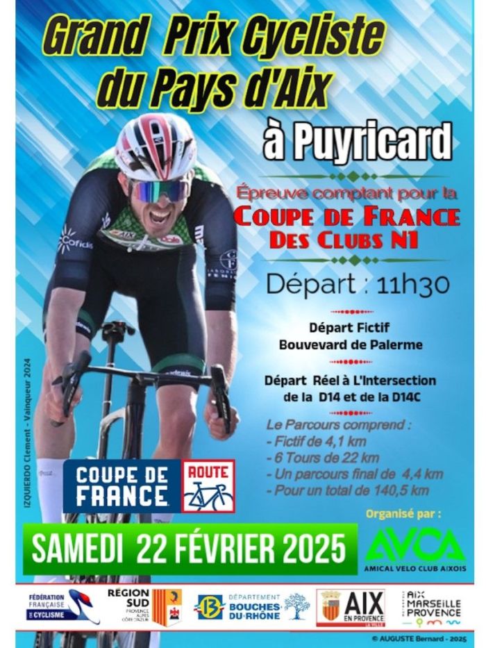 Le Grand Prix du Pays d'Aix, première manche de la Coupe de France N1, se dispute ce samedi 22 février à Puyricard (Bouches-du-Rhône). Au programme : 6 tours de circuit de 22 km + 6 km soit 138 kilomètres. Le départ fictif sera donné à 11h30 et le réel à 11h44. Le vainqueur succèdera au palmarès à Clément Izquierdo (voir classement). La course sera à suivre en direct sur DirectVelo. Retrouvez ci-dessous la liste des engagés et toutes les informations en cliquant ici. Remerciements à Frédéric Lafargue - www.stsport.fr