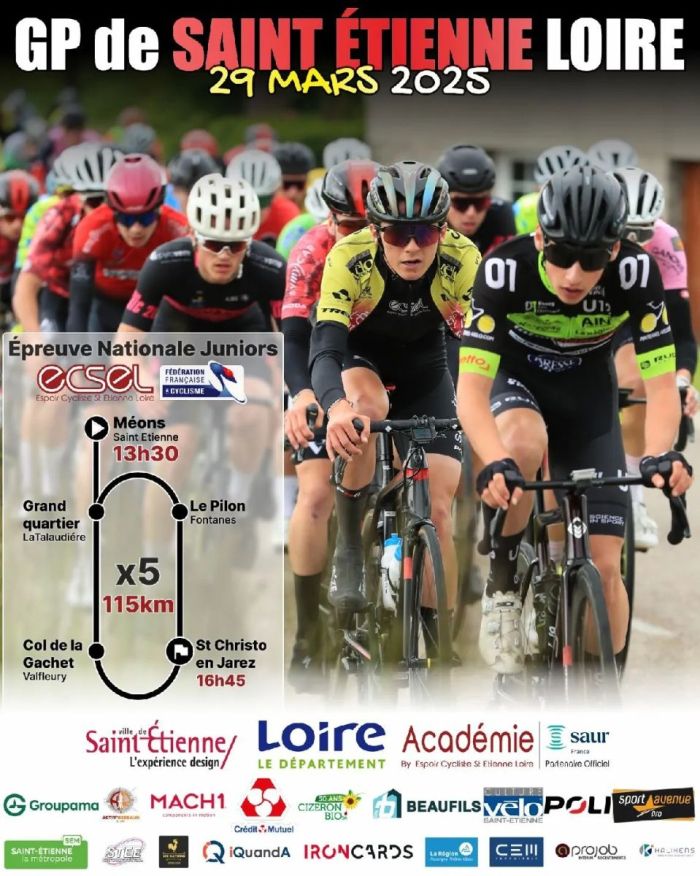 Le Grand Prix de Saint-Étienne Loire change de catégorie et devient une épreuve Fédérale Juniors. Le Parc des Sports de Méons qui accueillera le départ, alors que l'arrivée sera jugée à Saint-Christo-en-Jarez (Loire). Le circuit lui empruntera le Grand Quartier à La Talaudière, le Col de la Gachet, Saint-Christo-en-Jarez et Le Pilon. Cette boucle de 22 km devra être parcourue à cinq reprises. Avec quelques kilomètres en ligne au début, ce sont ainsi 116,3 km qui attendront les Juniors. Le départ réel sera donné à 13h50 depuis la Stèle Andrei-Kivilev. Le vainqueur succèdera au palmarès à Alexis Guérin (voir classement). La course sera à suivre en direct intégral sur DirectVelo. Retrouvez ci-dessous la liste des engagés et toutes les informations sur ecsel-cyclisme.fr. Remerciements à Phillipe Pradier - ecsel-cyclisme.fr