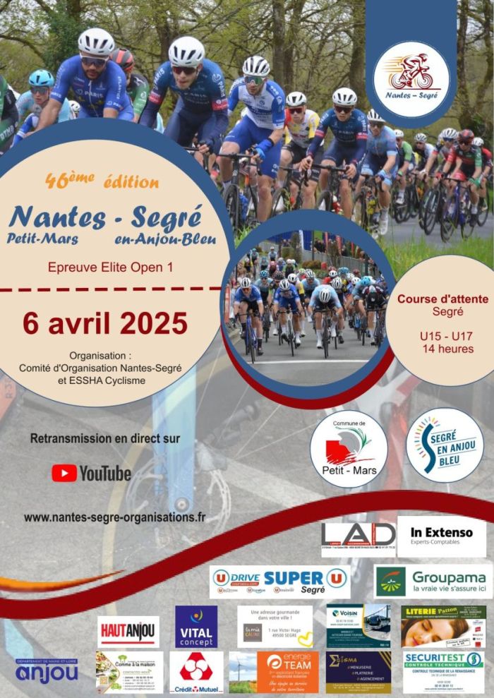 La 46e édition de la classique Nantes-Segré (Élite Nationale) se dispute ce dimanche 6 avril. Au programme : 121,1 km en ligne et 6 tours de circuit de 7,7 km soit 167,3 kilomètres. Le départ fictif sera donné au Petit-Mars (Loire-Atlantique) à 13h10 et le réel à 13h20. La victoire était revenue l'an dernier à Jocelyn Baguelin (voir classement). Retrouvez ci-dessous la liste des engagés et toutes les informations sur www.nantes-segre-organisations.fr. Remerciements à Patricia Nicolas, Comité d'Organisation Nantes Segré.