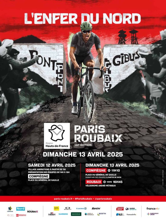 La 122e édition de Paris-Roubaix (1.UWT) se dispute ce dimanche 13 avril. 259,2 kilomètres -dont 55,3 kilomètres de pavés (30 secteurs)- figurent au programme de la course qui se déroule entre Compiègne et le vélodrome de Roubaix. Le départ fictif sera donné à 11h10 et le réel à 11h25. La victoire était revenue l'an dernier à Mathieu Van der Poel (voir classement 2024), double tenant du titre. Retrouvez ci-dessous la liste des engagés et toutes les informations sur www.paris-roubaix.fr
