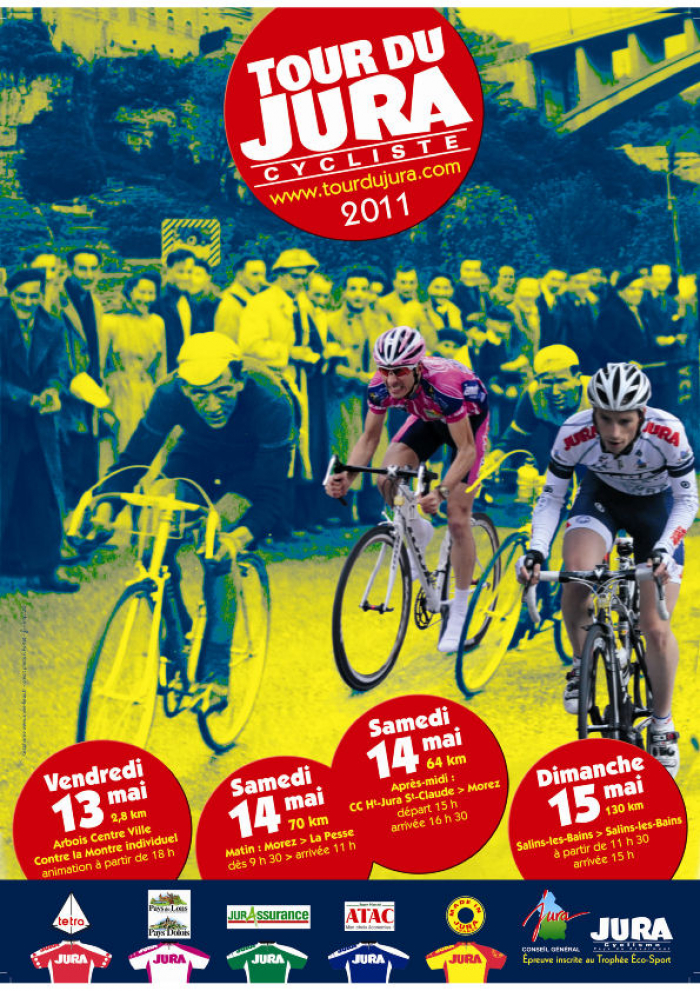 Le Tour du Jura 2011 aura lieu de vendredi à dimanche. Un prologue, deux demi-étapes et une étape sont au programme de l'épreuve remportée en 2010 par Emilien Viennet (CC Etupes). Le Tour du Jura est ouvert aux 123J. Une équipe peut aligner jusqu'à six coureurs, dont deux 1ère catégorie maximum. Retrouvez-ci-dessous la liste des engagés et plus d'informations sur www.tourdujura.com.