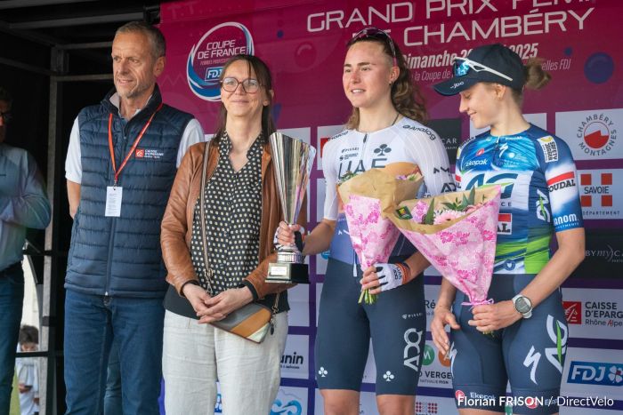 Erica Magnaldi (UAE Team ADQ) a remporté en solitaire, ce dimanche, la 22e édition du Grand Prix Féminin de Chambéry (WE 1.1), première manche de la Coupe de France Élite Femmes FDJ, disputée autour de Chambéry-le-Vieux (Savoie) sur une distance totale de 119,4 kilomètres (lire ici). Le podium est complété par Mona Mitterwallner (Human Powered Health) et Léa Curinier (FDJ-Suez). Aller à la réaction de : 5e « Il y a trois jours, j'étais encore en stage en altitude en Sierra Nevada. Nous savions que nous avions bien travaillé et aujourd'hui nous étions en forme. Notre objectif était de rendre la course le plus difficile possible pour se retrouver avec le moins de concurrentes possible pour jouer la victoire. 11e et Meilleure grimpeuse « Je suis très contente de terminer 3e Espoirs et de remporter le classement de la montagne. Nous n'avions pas vraiment de stratégie sauf celle de durcir la course et c'est ce qui s'est passé. Mes prochaines courses seront les deux jours du Festival Elsy Jacobs au Luxembourg ».