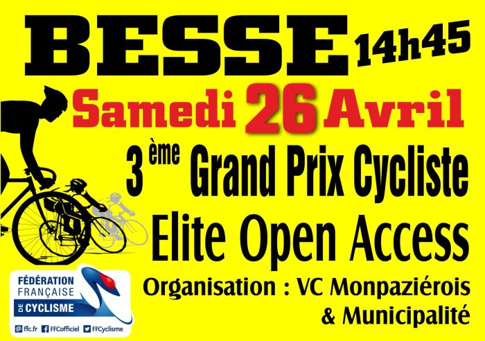 La troisième édition du Grand Prix du Pays de Besse (Élite, Open 1-2-3 et Access 1-2-3-4) se dispute ce samedi 26 avril à Besse dans le département de la Dordogne. 97,560 kilomètres -12 tours de 8,130 km- sont au programme de la course organisée par le VC Monpazierois. Le départ sera donné à 14h45. Le vainqueur succèdera au palmarès au Britannique Dexter Leeming-Sykes (voir classement). Retrouvez ci-dessous la liste des engagés de l'épreuve servant de support au Championnat de Dordogne Élite et Open 1. Remerciements à Jean-Louis Gauthier.