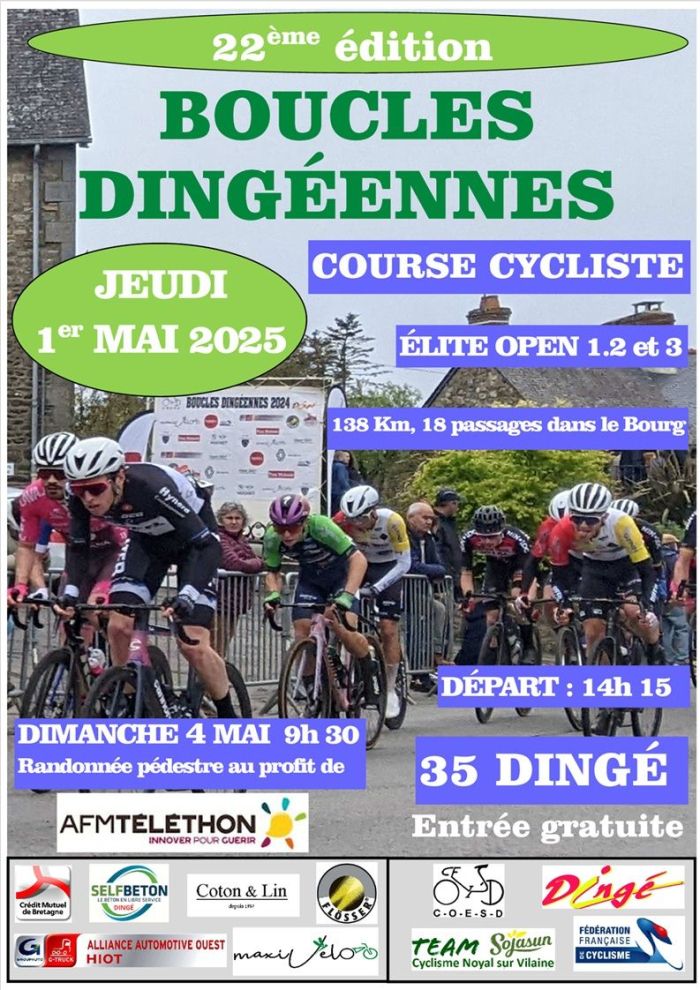 Le Comté d'Organisation d'Épreuves Sportives Dingéennes organise ce jeudi 1er mai, à Dingé (Ille-et-Vilaine), la 22e édition des Boucles Dingéennes. Au programme de l'épreuve Élite et Open 1-2-3 : un circuit de 14,8 km à parcourir 9 fois plus une boucle de 4,1 km soit 137,3 kilomètres. Le départ sera donné à 14h15. Le vainqueur succédera au palmarès à Ludovic Morice (voir classement). Retrouvez ci-dessous la liste des engagés et toutes les informations en cliquant ici. Remerciements à Denis Leiros.
