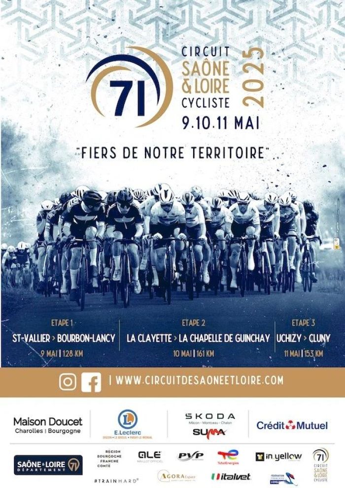 La 53e édition du Circuit de Saône-et-Loire (Élite Nationale) se dispute du vendredi 9 au dimanche 11 mai prochains. Trois étapes en ligne figurent au programme de l'épreuve. Le vainqueur succédera à Alexandre Jamet (voir classements). La course sera à suivre en direct intégral sur DirectVelo. Retrouvez ci-dessous la liste des étapes et des partants. Toutes les informations sur circuitdesaoneetloire.com. Remerciements à Frédéric Lafargue - www.stsport.fr