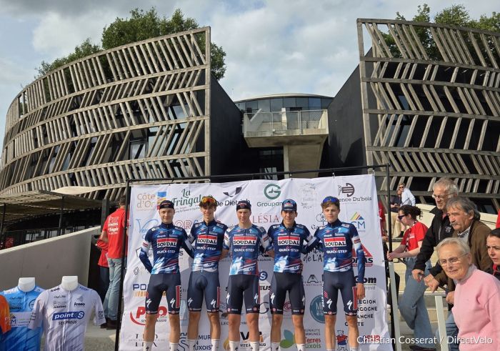 La journée ne pouvait pas être meilleure pour la Soudal Quick-Step U19. Après la victoire du matin pour Sune De Valcke, la structure belge a remis le couvert ce dimanche après-midi, sur le chrono par équipes de la Côte d'Or Classic (voir classement). Et ce malgré l'abandon de Simon Defrance sur l'étape en ligne. "Nous sommes tous très heureux. Malheureusement, Simon a chuté dès la première étape, mais il n'a rien de cassé. C'était plus difficile pour nous", raconte Sune De Valcke, invaincu durant la journée, donc. Mais même à cinq, les Belges avaient des arguments. D'abord, Valentin Petillon a fait le départ à fond. "Je ne suis pas très bon en bosse, du coup j'ai fait le départ. Après un début de saison très difficile, je suis content que les sensations reviennent et que le plaisir revienne aussi. J'ai vite détaché du groupe et eux sont partis à quatre. Ils ont fini le travail".