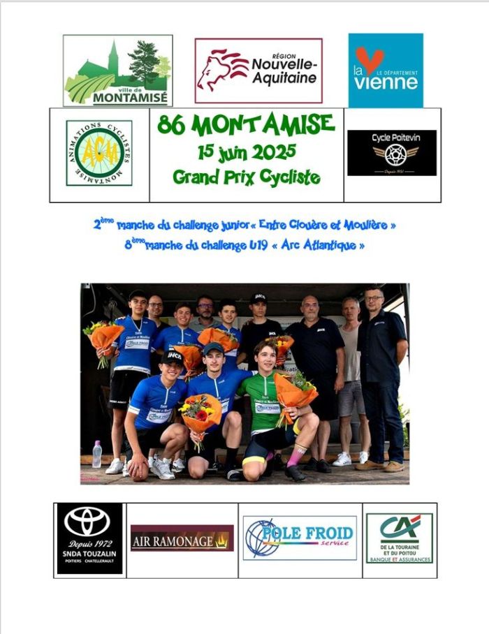 La 70e édition du Grand Prix de Montamisé (Fédérale Juniors) se dispute ce dimanche 15 juin dans le département de la Vienne. Au programme : 9 tours de 13,6 km, soit une distance totale de 122,4 kilomètres. Le départ sera donné à 13h30. Le vainqueur succédera au palmarès à Johan Chardon. Retrouvez ci-dessous la liste des engagés et toutes les informations sur cyclepoitevin86.fr.