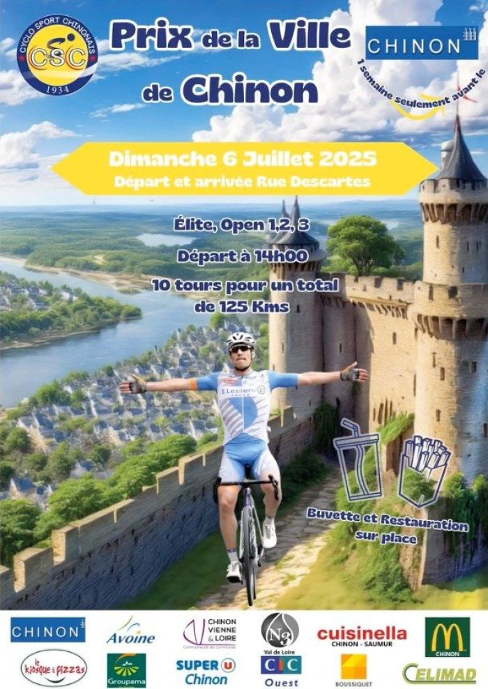 Le Cyclo Sport Chinonais organise ce dimanche 6 juillet le Prix de la Ville de Chinon (Indre-et-Loire). Au programme de l'épreuve Élite et Open 1-2-3 : un circuit de 12,5 km à effectuer 10 fois soit 125 kilomètres. Le départ sera donné à 14h. La victoire était revenue l'an dernier à David Boutville. Retrouvez ci-dessous la liste des engagés et toutes les informations en cliquant ici. Remerciements à Jacques Fonteneau.
