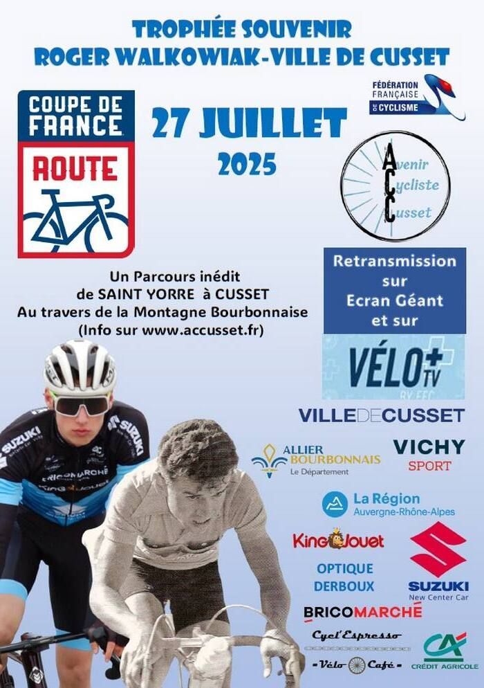 Le Trophée Souvenir Roger Walkowiak-Ville de Cusset, quatrième manche de la Coupe de France N1, se dispute ce dimanche 27 juillet. Les coureurs devront couvrir 173 kilomètres entre Saint-Yorre et Cusset (Allier). Le départ fictif sera donné à 12h, et le départ réel à 12h05. La victoire était revenue l'an dernier à l'Australien Kane Richards. Après trois manches, le VC Rouen 76 occupe la tête de la Coupe de France N1. La course sera à suivre en direct intégral sur DirectVelo. Retrouvez ci-dessous la liste des partants et toutes les informations sur www.accusset.fr. Remerciements à Brigitte et Henri Lafargue - www.stsport.fr