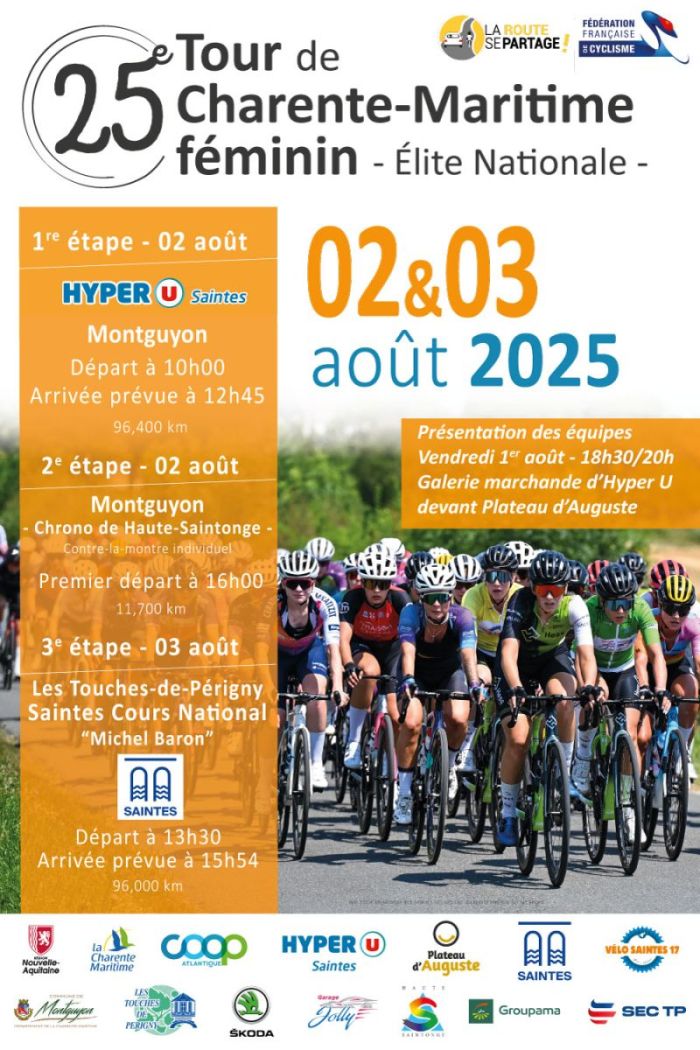 La 25e édition du Tour de Charente-Maritime Féminin (Nationale Femmes) se dispute les samedi 2 et dimanche 3 août. Trois étapes, dont un contre-la-montre individuel, figurent au programme de l'épreuve 2.15. La lauréate succédera à la Néerlandaise Maria Apolonia van 't Geloof. Retrouvez ci-dessous la liste des étapes et des engagées de la course organisée par l'Avenir Cycliste Nieul-les-Saintes. Remerciements à Hubert Guilbaud, Vendée Chrono Finish.