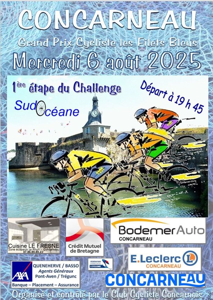 Le Grand Prix Cycliste des Filets Bleus, première épreuve du Challenge Sud Océane, se dispute ce mercredi 6 août à Concarneau (Finistère). Au programme de la course organisée par le Club Cycliste Concarnois : un circuit de 2,2 km à parcourir 40 fois soit 88 kilomètres. Le départ sera donné à 19h45. La victoire était revenue l'an dernier à Adrien Garel. Retrouvez ci-dessous la liste des engagés de l'épreuve Élite et Open 1-2-3. Toutes les informations en cliquant ici. Remerciements à Dominique Dauphiné, CC Concarneau.