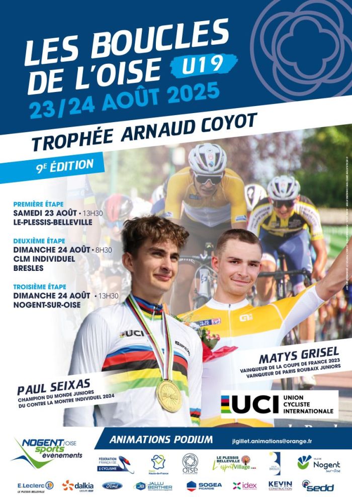 La 9e édition des Boucles de l'Oise Juniors-Trophée Arnaud-Coyot (MJ 2.1) se dispute les samedi 23 et dimanche 24 août. Trois étapes, dont un contre-la-montre individuel, figurent au programme de l'épreuve U19. Le vainqueur succédera au Néo-Zélandais Reef Roberts. Retrouvez ci-dessous la liste des étapes, des engagés et toutes les informations sur www.bouclesdeloise.com. Remerciements à Frédéric Lafargue - www.stsport.fr