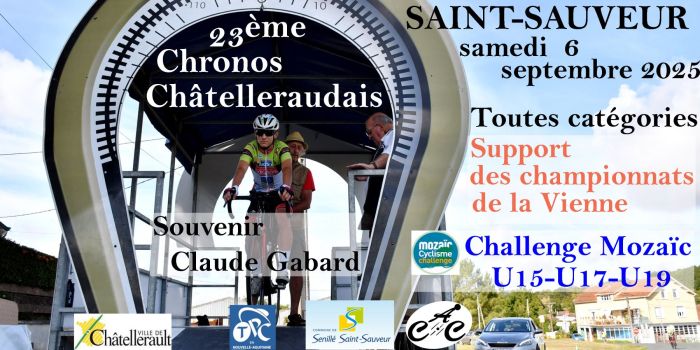 L'Avenir Cycliste Châtelleraudais organise ce samedi 6 septembre le 23e Chrono Châtelleraudais-Souvenir Claude Gabard à Senillé-Saint-Sauveur, support du Championnat départemental de la Vienne. 21 kilomètres sont au programme de l'épreuve chronométrée Hommes et Femmes Élite, Open 1-2-3 et Access 1-2-3-4. La victoire était revenue l'an dernier à Grégory Pouvreault. Retrouvez ci-dessous les engagé(e)s avec les horaires de départ. Toutes les informations sur acchatellerault.free.fr.