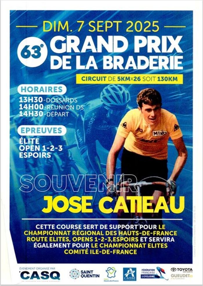 Le VC Amateur Saint-Quentin organise, ce dimanche 7 septembre, le 63e Grand Prix de la Braderie de Saint-Quentin–Souvenir José Catieau, support du Championnat des Hauts-de-France (Élite, Open 1-2-3 et Espoirs) et d'Île-de-France (Élite). Au programme de la course : un circuit de 5 km à parcourir 26 fois, soit une distance totale de 130 kilomètres. Le départ sera donné à 14h30. Émilien Vandermeersch (Team Lockimmo.com) avait remporté, l'an dernier, le titre de Champion des Hauts-de-France. Dany Maffeïs s’était adjugé le Championnat d’Île-de-France. Retrouvez ci-dessous la liste des engagés. Remerciements à Jean-Baptiste Campoverde, VCA Saint-Quentin.