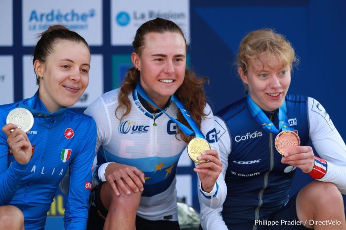 Elle devait finir par en claquer une pour conclure son cursus Espoirs parfaitement, c'est chose faite. Paula Blasi est devenue Championne d'Europe de la catégorie, ce vendredi matin, à Guilherand-Granges, grâce à une attaque dans le final de la course face à trois concurrentes. L'Espagnole avait une émotion particulière en franchissant la ligne. Déçue au Tour de l'Avenir, sur sa faim au chrono du Championnat du Monde avant de monter sur le podium de la course en ligne, voilà les petites frustrations oubliées pour la sociétaire d'UAE Team ADQ. Avant de passer au gravel et au cyclo-cross pour le plaisir, Paula Blasi a confirmé les attentes placées en elle, une fois de plus, alors qu'elle découvre encore l'univers du cyclisme. Tout sourire, elle est revenue avec DirectVelo sur cette journée rêvée, le Mondial rwandais, et la pression qui l'entoure parfois dans ce type de rendez-vous.