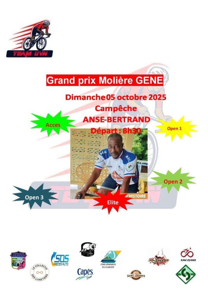 Le Grand Prix Molière Gène se dispute ce dimanche 5 octobre à Anse-Bertrand (Guadeloupe). 104,6 kilomètres sont au programme. Le départ sera donné à 8h30. La victoire était revenue l'an dernier à Lionel Miny. Retrouvez ci-dessous la liste des engagés de l'épreuve Élite, Open et Access.