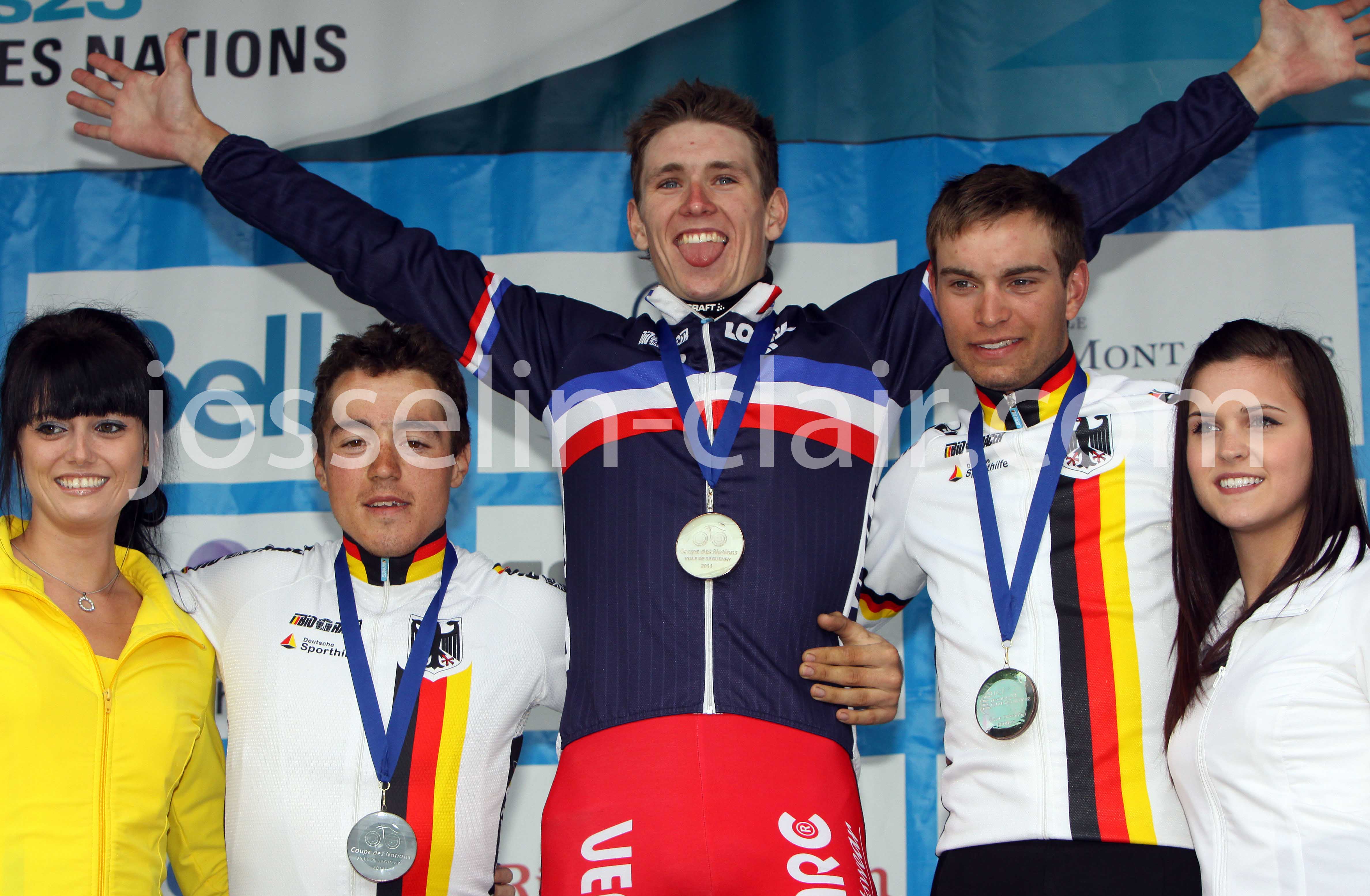 Le podium de la 4e étape : Yannick Mayer (2e), Arnaud Démare (1er), Marcel Meisen (3e)