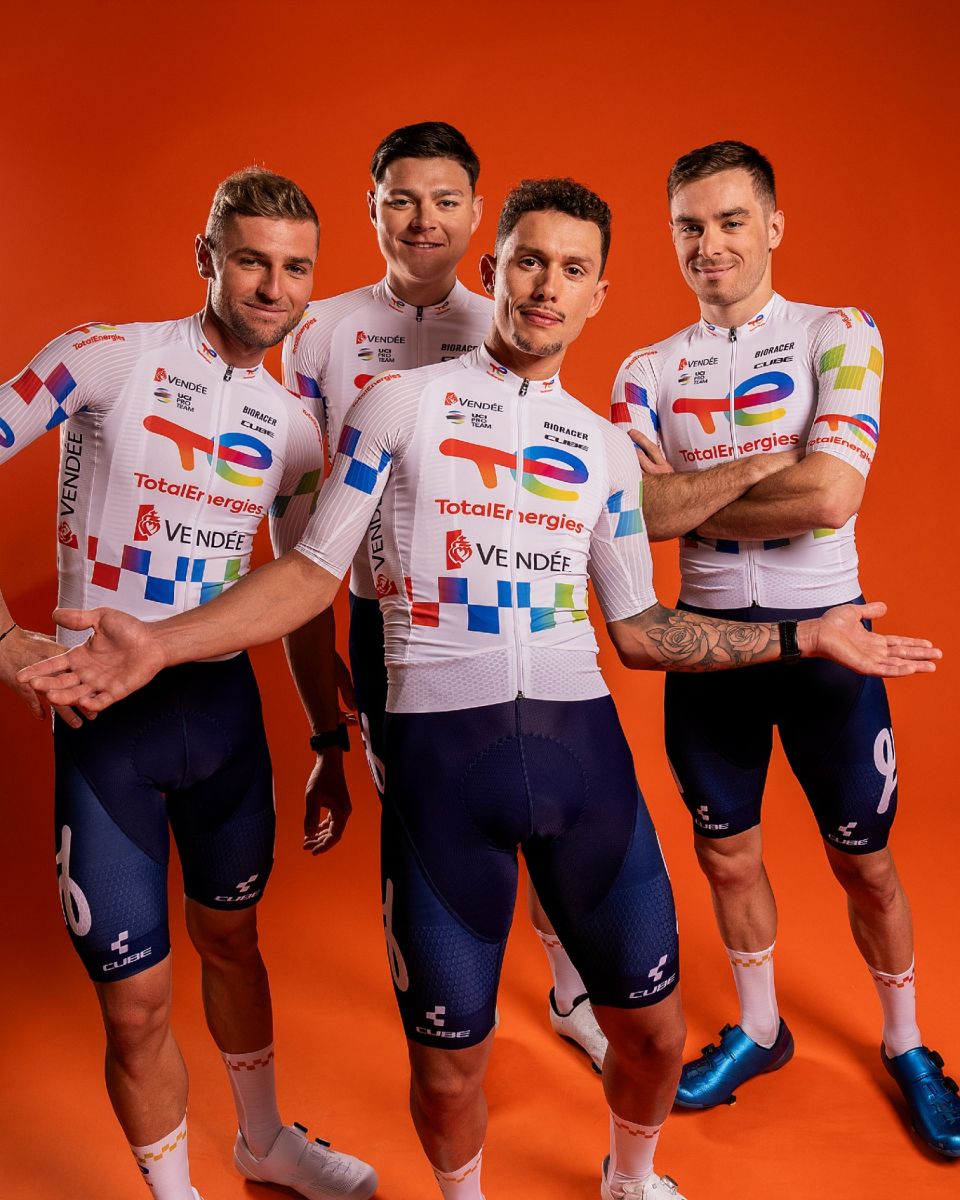 La formation TotalEnergies comptera en 2026 un effectif de 28 coureurs. Ils rouleront avec le même maillot, en partie à damiers, que lors du dernier Tour de France. Il faut noter l'apparition de Cube, qui remplace ENVE comme partenaire cycles. Voici le maillot en photo.