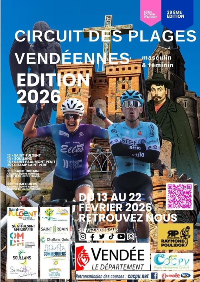 La première des six épreuves de la 39e édition du Circuit des Plages Vendéennes (Élite Nationale) se dispute ce vendredi 13 février autour de Saint-Fulgent (Vendée). Au programme : 1 tour de 18,5 km + 6 tours de 20,430 km soit au total 141 kilomètres. Le départ fictif sera donné à 12h50 et le réel à 13h. La course sera à suivre en direct sur DirectVelo. Retrouvez ci-dessous la liste des épreuves et les partants de la première manche. Toutes les informations sur cocpv.net.
