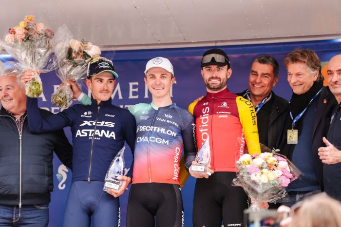 Marco Brenner et Lenny Martinez ont réalisé un très beau numéro, ce dimanche, lors du Tour des Alpes-Maritimes. Mais c’est bel et bien Paul Lapeira qui a coupé la ligne d’arrivée en premier, dans les faubourgs boisés de Biot, à la faveur du très gros travail de ses coéquipiers de Decathlon CMA CGM et d’un dernier kilomètre en montée où il s’est montré surpuissant. “C’est une vraie satisfaction. Ce n’était pas passé loin à Bessèges, je savais que j’avais les jambes depuis le début de saison alors je suis vraiment très content, d’autant que j’ai un moment cru que ça n’allait pas le faire”, se réjouissait-il derrière le podium protocolaire. “Antoine (Lhote) et Aurélien (Paret-Peintre) ont fait un boulot vraiment super, sans eux je ne gagnais pas”.