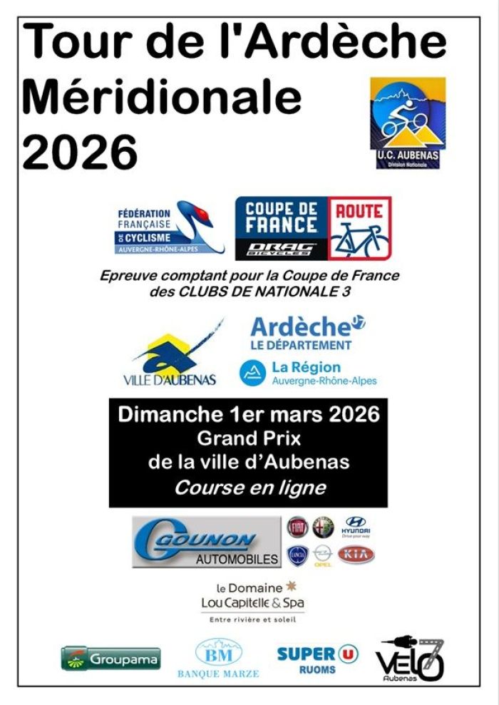 Le Tour de l'Ardèche Méridionale-Grand Prix de la ville d'Aubenas, première manche de la Coupe de France N3, se déroule ce dimanche 1er mars entre Vogüé et Aubenas (Ardèche). 149 kilomètres sont au programme. Le départ fictif sera donné à 11h et le réel à 11h03. Retrouvez ci-dessous la liste des engagés et toutes les informations en cliquant ici. Remerciements à Frédéric Lafargue - www.stsport.fr