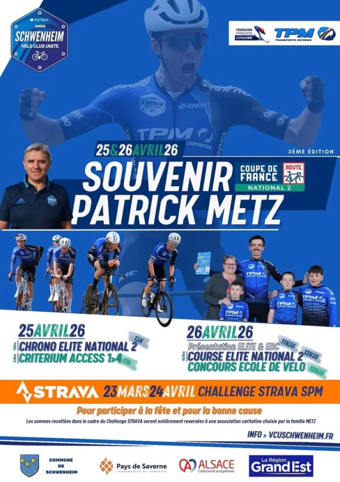 La troisième édition du Souvenir Patrick-Metz, deuxième manche de la Coupe de France N2, se disputera les samedi 25 et dimanche 26 avril dans le Bas-Rhin. Un contre-la-montre individuel et une étape en ligne figurent au programme. Le vainqueur succédera à Artus Jaladeau. Le GSC Blagnac Vélo Sport 31 occupe la tête de la Coupe de France N2. La course sera à suivre en direct sur DirectVelo. Retrouvez ci-dessous la liste des étapes et des engagés. Toutes les informations sur www.vcuschwenheim.fr. Remerciements à Frédéric Lafargue - www.stsport.fr