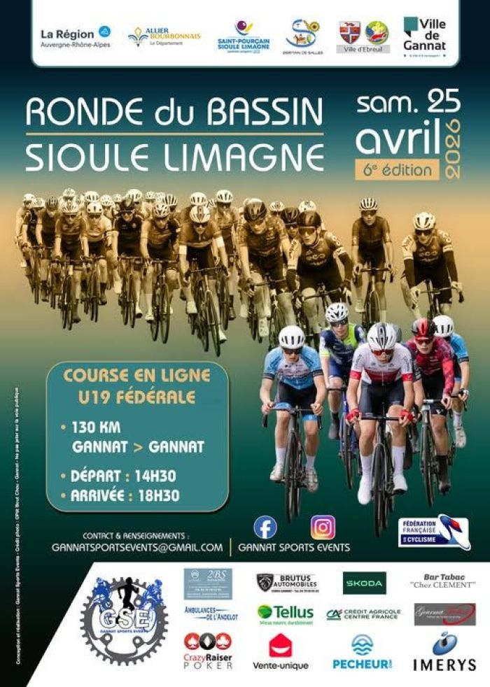 La Ronde du Bassin Sioule Limagne change de format. Elle devient cette année une course d'un jour. La sixième édition de l'épreuve Fédérale Juniors se disputera ce samedi 25 avril autour de Gannat (Allier). 130 kilomètres seront au programme. Le départ sera donné à 14h30. Louis Toupenet s'était imposé l'an dernier. Retrouvez ci-dessous la liste des engagés. Remerciements à Frédéric Lafargue - www.stsport.fr