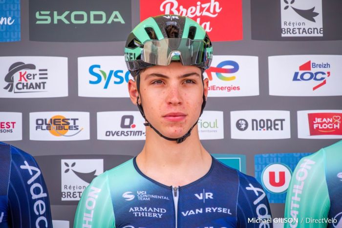 Aubin Sparfel est directement dans le jeu. Offensif dans le final de l’étape inaugurale d’un Tour de Bretagne dont il avait pris la 3e place finale l’an dernier, le puncheur de la réserve de Decathlon CMA CGM s’est classé 3e, ce samedi, dans les rues de Pipriac, en Ille-et-Vilaine, après avoir été devancé au sprint par l’Italien Alessio Magagnotti. DirectVelo a recueilli la réaction du coureur de 19 ans après la course qui a récolté 5 secondes de bonification dans la journée.