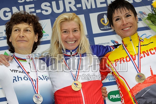 Christel Ferrier-Bruneau (Gauss) est devenue samedi championne de France dames à Boulogne-sur-Mer (Pas-de-Calais). Elle devance Jeannie Longo (Rhône-Alpes) et Magdaléna de Saint-Jean (Provence). Christel Ferrier-Bruneau succède au palmarès à Mélodie Lesueur. En espoirs, le titre revient à Audrey Cordon. Elle devance Amélie Rivat (Rhône-Alpes) et Pauline Ferrand-Prévot (Champagne-Ardenne). Retrouvez ci-dessous quelques photos et plus de clichés sur www.velofotopro.com.