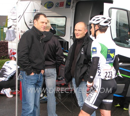 Frédéric Guesdon est venu voir Benjamin Le Montagner et Yann Dejan, le directeur sportif du comité Bretagne sur ce Tour de Bretagne.