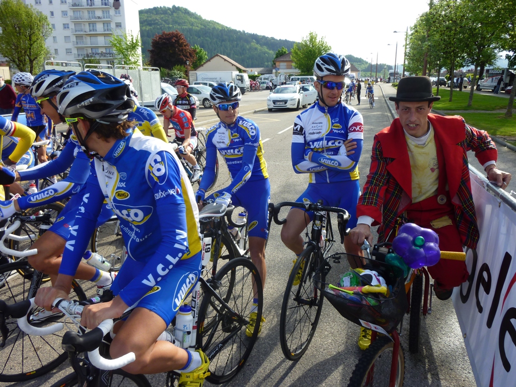 Pierre-Yves Sanlaville (Team Vulco VC Vaulx-enVelin) aux côtés du clown de l'épreuve