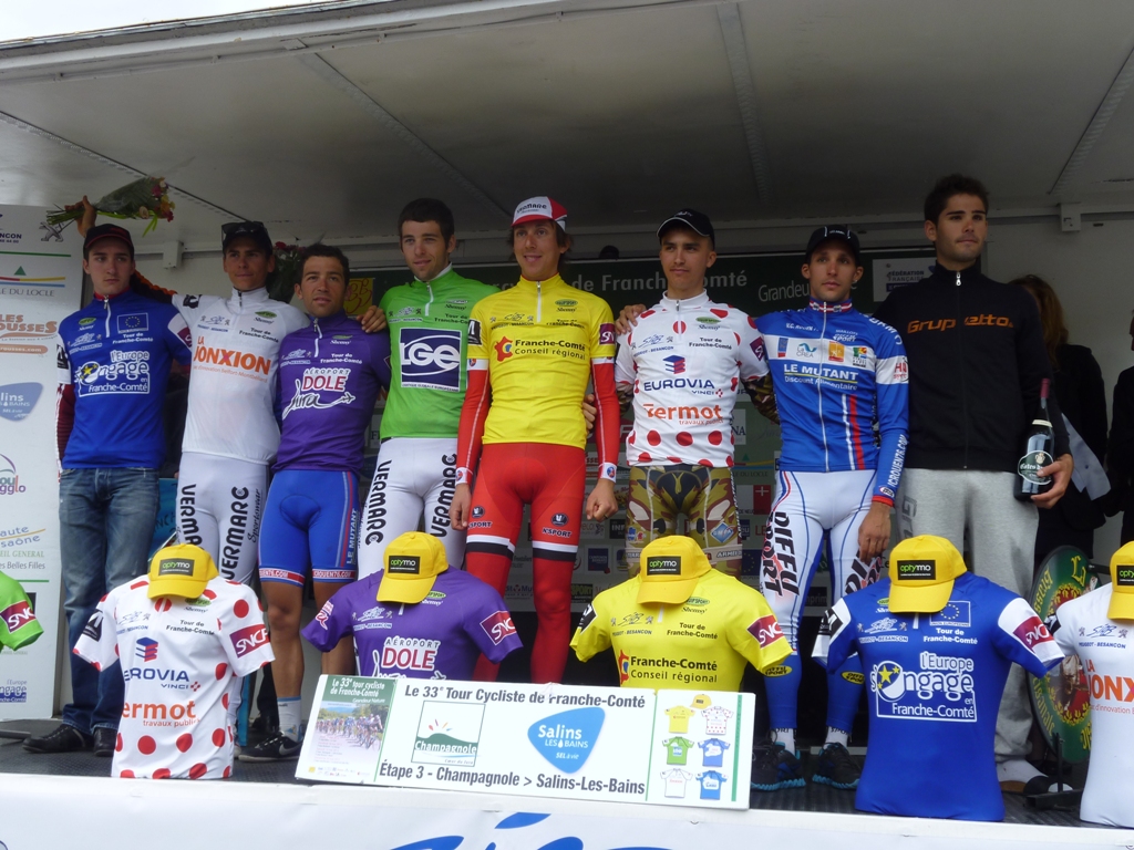 Cyrille Patoux (VC Rouen 76) a remporté au sprint ce samedi matin la 3e étape du Tour de Franche-Comté (Elite Nationale), courue entre Champagnole et Salins-les-Bains sur 52.2 km. Il devance Julian Alaphilppe (Armée de Terre) et Emilien Viennet (CC Etupes). Stéphane Rossetto (CC Nogent-sur-Oise) a conservé son maillot jaune de leader au classement général. Retrouvez ci-dessous quelques clichés au départ de l'étape et à l'arrivée sur le podium.