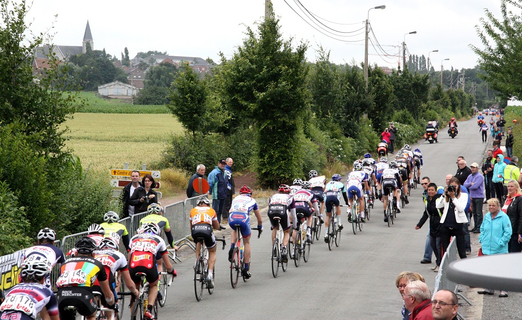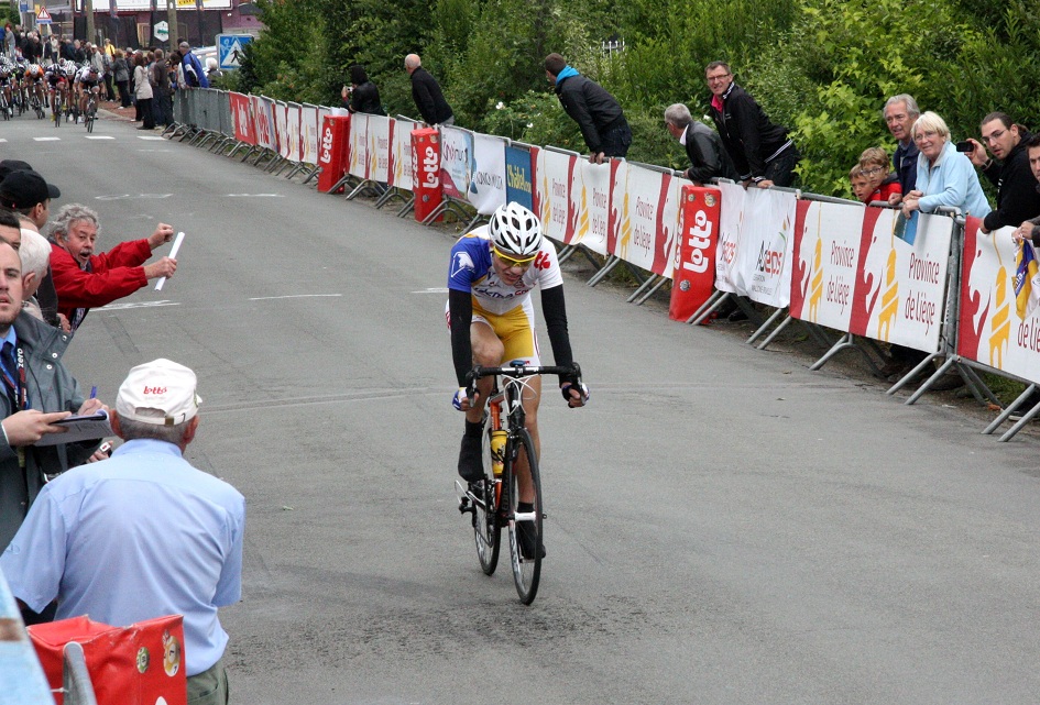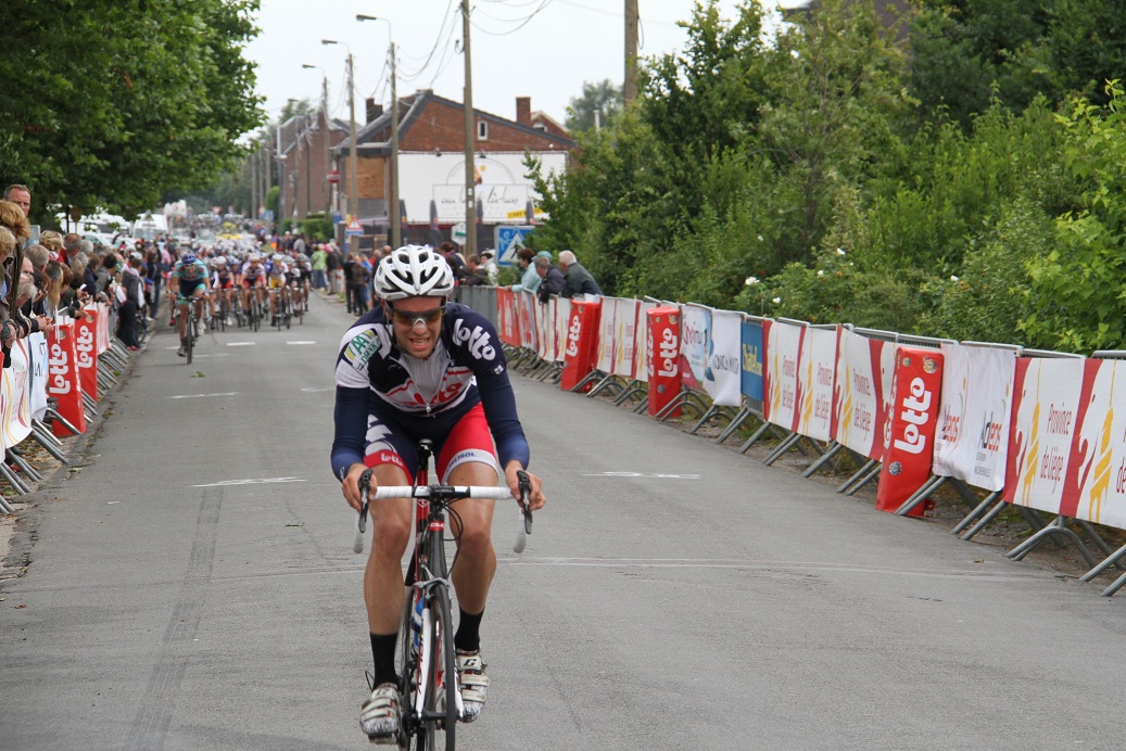 Jimmy Janssens (Lotto-Belisol U23) sera repris peu après le dernier passage sur la ligne d'arrivée soit à 4,5 kilomètres du but.