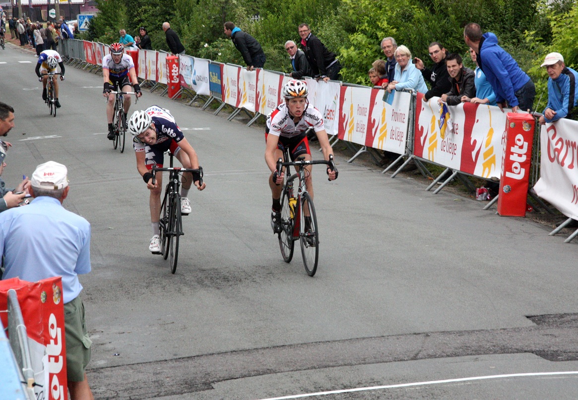 Kess Heytens (BCV Works) remporte la première étape du Tour de Liège 2012 juste devant Thomas Sprengers (Lotto-Belisol U23) et Frederik Backaert (United CT).