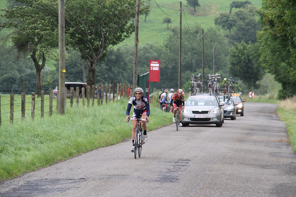 Dans la côte d'Henri-Chapelle, un groupe de 12 coureurs s'est extirpé. Gertjan De Vos, à l'image, passe en tête au sommet.