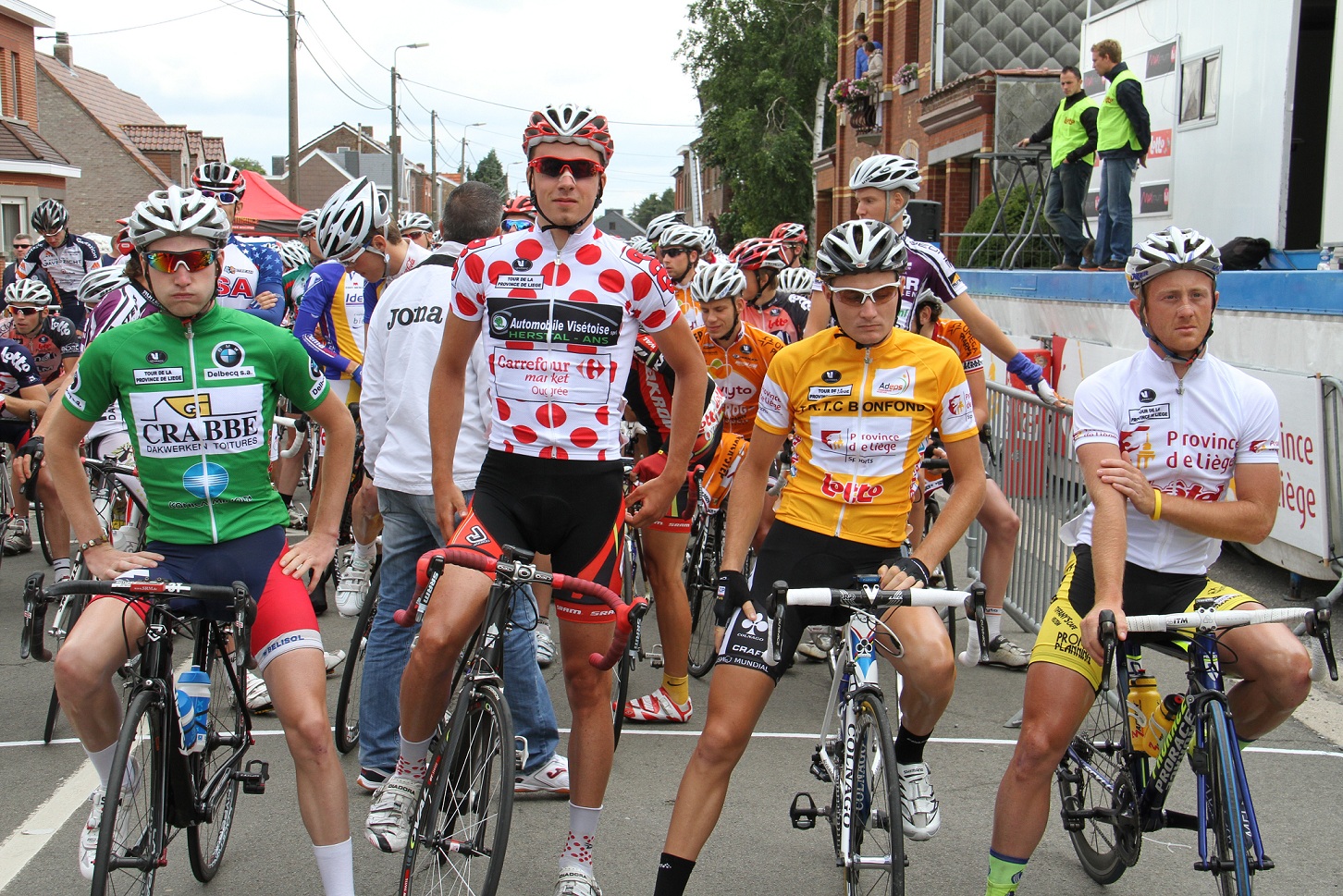 Les maillots distinctifs au départ de la 3e étape à Remicourt: Sprengers (en vert - classement aux points), De Vos (à pois - classement des monts), Petrus (en jaune - leader du Tour de Liège), Fauville (en blanc - classement des sites touristiques).