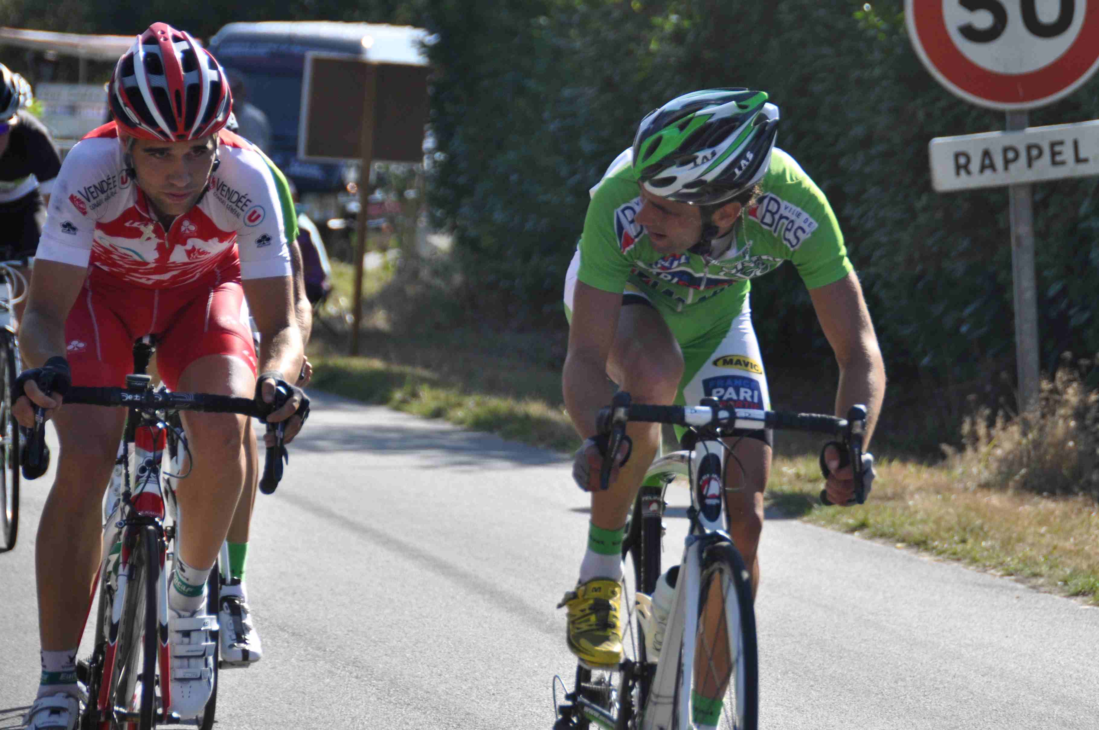 Derrière l’échappée, Erwan Brenterch (VC Rouen 76) et David Chopin (Hennebont Cyclisme), caché, partent en contre. Il reste 4 tours.