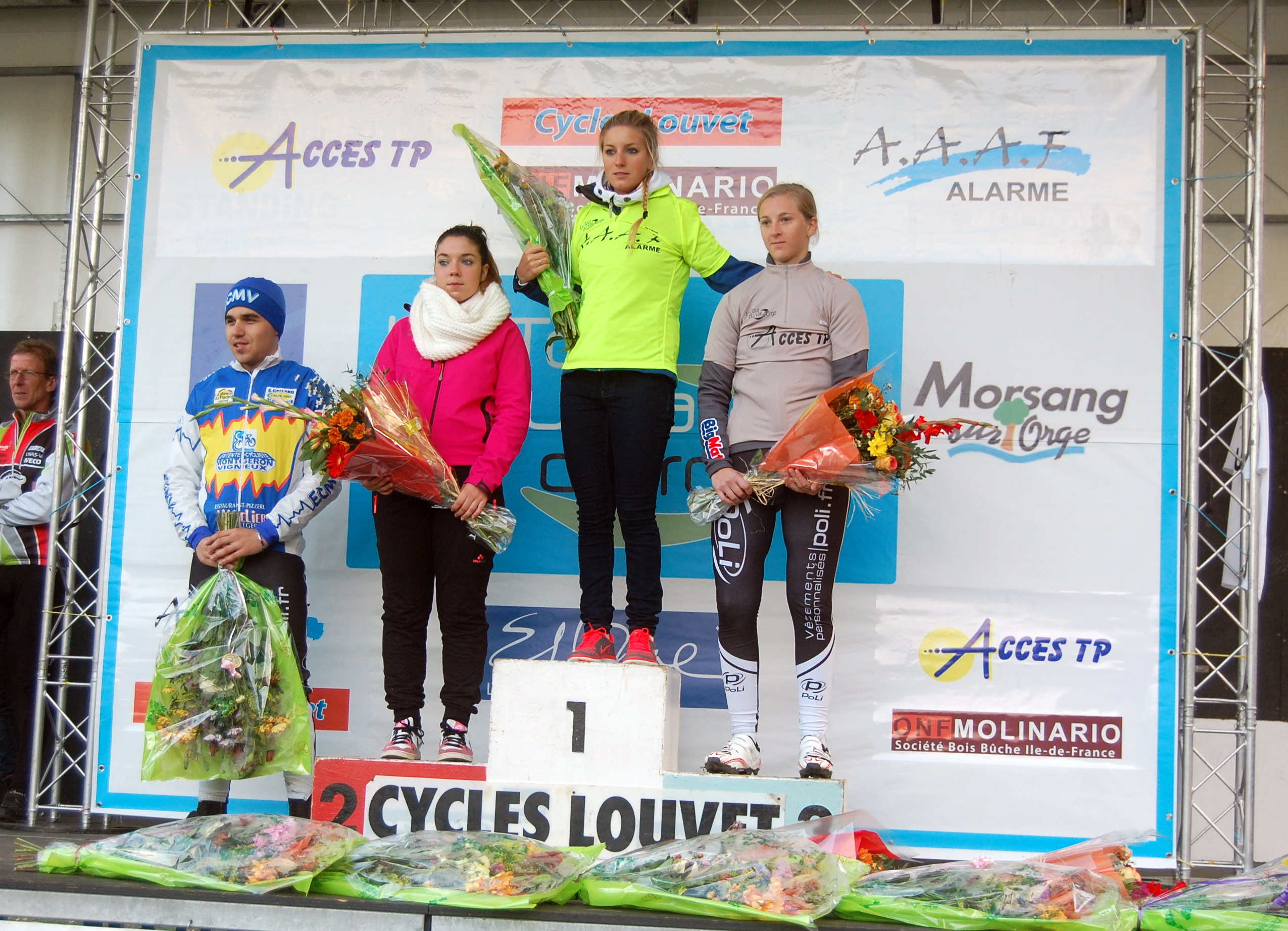 Le podium du Circuit Nord-Essonne Dames avec Axelle Dubau-Prévot (2e), Pauline Ferrand-Prévot (1er) et Manon Hegoburu (3e)
