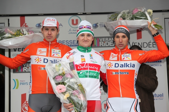 Maxime Le Montagner et Cyrille Patoux (tous deux à Roubaix Lille Métropole) accompagnent Tomasz Olejnik sur le podium.
