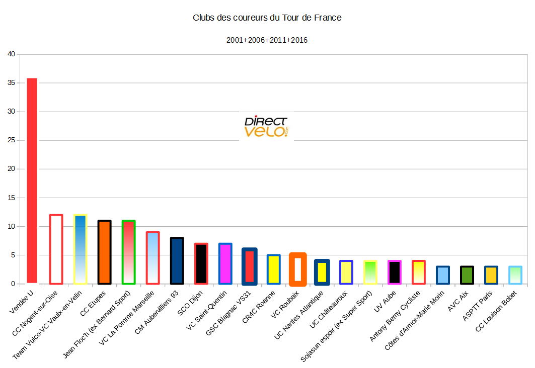 Le Vendée U occupe la tête des clubs représentés dans le peloton de juillet. Sept coureurs des éditions 2016 et 2001, et onze de celles de 2011 et 2006, ont été formés dans la maison vendéenne. "Avoir tant de coureurs présents sur le Tour année après année démontre le bon travail que l'équipe amateur effectue en amont", commente Damien Pommereau, directeur sportif au Vendée U.
