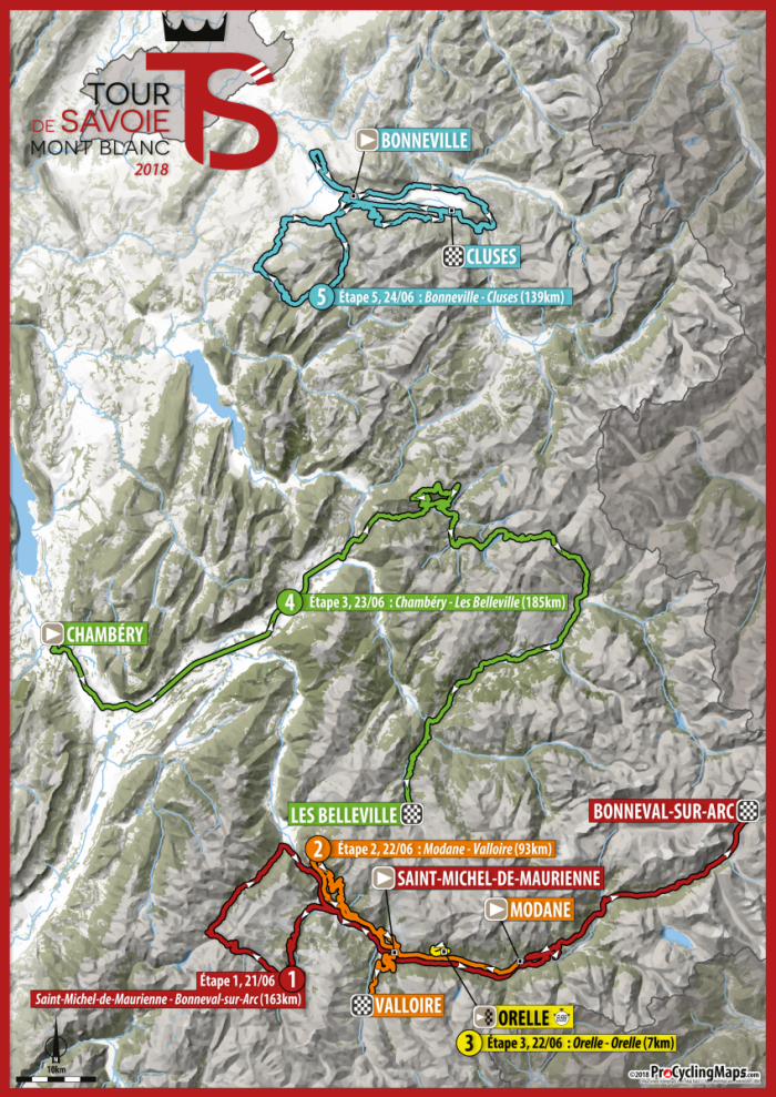 L'épreuve s'élancera Saint-Michel-de-Maurienne pour se terminer à Cluses. Dès le premier jour, le Col de la Croix-de-Fer, par Saint-Sorlin-d'Arves, est au programme.