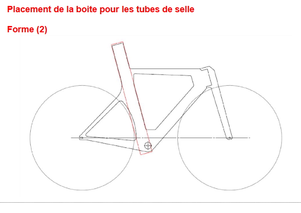 Et pour anticiper 2021, attention si vous voulez acheter un vélo de contre-la-montre : à partir du 1er janvier 2021, il n'y aura plus de différences entre les règles du dessin des cadres pour les courses sur route (course en ligne et contre-la-montre), sur piste et le cyclo-cross. Ainsi, l'épaisseur de tous les tubes du cadre pour les courses en ligne pourra descendre à 1 cm (la limite est de 2,5 cm actuellement). En revanche, la tige de selle doit s'inscrire entièrement dans le prolongement de la forme du tube de selle (de 8 cm de large), y compris donc pour les vélos de chrono comme sur le schéma de l'UCI ci-dessous.
