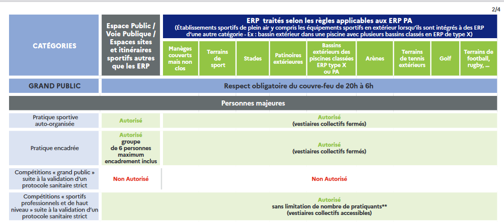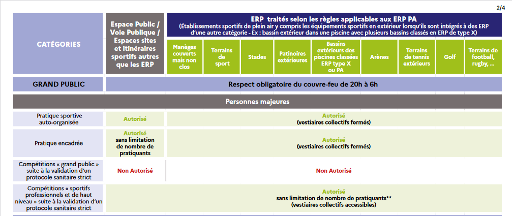 Le ministère des sports a mis à jour son tableau des déclinaisons sanitaires pour le sport.