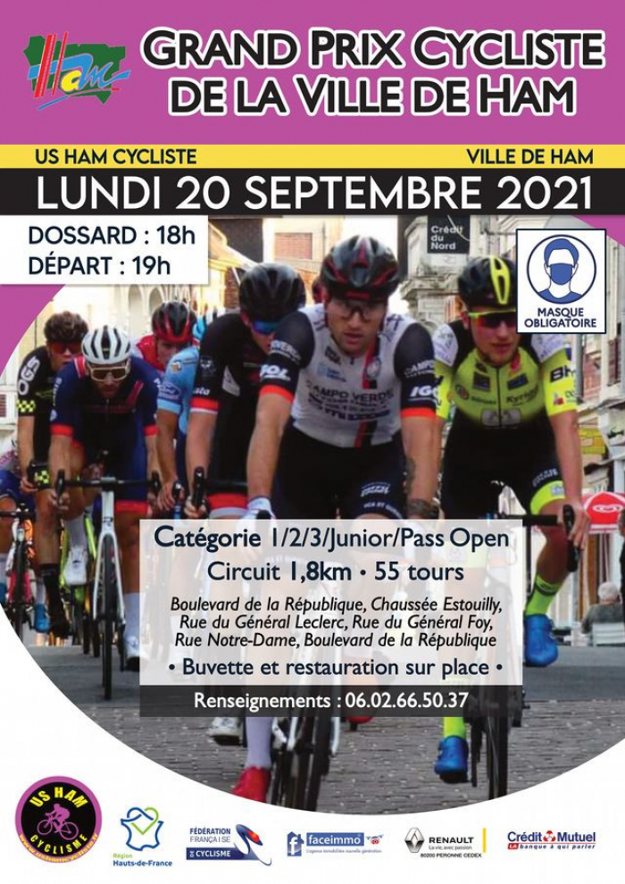 Le Grand Prix de la Ville de Ham se dispute ce lundi 20 septembre en semi-nocturne dans le département de la Somme. Au programme de l'épreuve Toutes Catégories : un circuit de 1,8 km à parcourir 55 fois soit une distance totale de 99 kilomètres. Le départ sera donné à 19h00. La victoire était revenue l'an dernier à Vincent Pastot (voir classement). Retrouvez ci-dessous la liste des engagés de la course organisée par l'US Ham Cycliste.