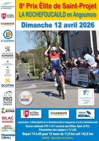 vendredi 10 avril 2026 Illustration de Prix de Saint-Projet à La Rochefoucauld-en-Angoumois : Les engagés Route Prix de Saint-Projet à La Rochefoucauld-en-Angoumois : Les engagés lu L'Union Athlétique de La Rochefoucauld organise ce dimanche 12 avril la 8e édition du Prix de Saint-Projet à La Rochefoucauld-en-Angoumois (Charente). Au programme de l'épreuve Élite Nationale : un circuit de 11,9 km à parcourir 12 fois soit une distance totale de 142,8 kilomètres. Le départ sera donné à 14h. Le vainqueur succèdera au palmarès à Artus Jaladeau (GSC Blagnac Vélo Sport 31). Retrouvez ci-dessous...