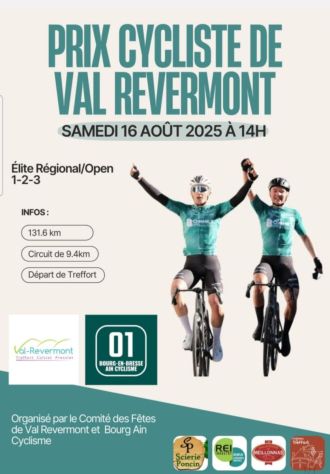 vendredi 15 août 2025 Illustration de Prix de Val-Revermont : Les engagés Route Prix de Val-Revermont : Les engagés lu Le Comité des Fêtes de Val-Revermont et Bourg-en-Bresse Ain Cyclisme organisent ce samedi 16 août le Prix Cycliste de Val-Revermont (Ain). Au programme : un circuit de 9,4 km à effectuer 14 fois pour une distance totale de 131,6 kilomètres. Le départ sera donné à 14h. Le vainqueur succédera au Danois Sander Andersen. Retrouvez ci-dessous la liste des engagés de l'épreuve Élite et Open 1-2-3.La liste des engagés...